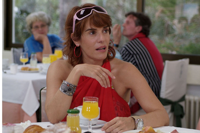 AA. La verdad es que para interpretarla me basé en algunos referentes. Creo que el primer referente en que me basé fue en las madres, porque, a qué madre no le hemos oído culpar al marido de todo lo que le pasa; decir que todo lo bueno que tienen los hijos es suyo, o cosas como: “si no fuera por mí, no sé qué sería de esta familia”, “el día que me líe la manta a la cabeza yo no sé qué va a ser de esto”… Todas estas cosas, las tenemos en la cabeza, creo que es el “fraseario” de las madres. Eso fue como un embrión. Indudablemente, esta mujer, Sole, está en una situación límite, trabajando durante los 350 días restantes, sin días de fiesta como todas las amas de casa, que trabaja de lunes a domingo las veinticuatro horas del día, y ve que va a tener quince días en que no va a cocinar, ni fregar, ni hacer las camas, y va a tener servicio de habitaciones –lo más que le puede pasar-, y ve que todo se va al garete… Pues todo eso a ella le estresa. Aparte de todo esto, también he cogido referentes de ciertas películas europeas, como Divorcio a la italiana, cierta manera de hacer un poco extrovertida y de mujer de carácter, que podría tener cierta comunión con este tipo de personaje.