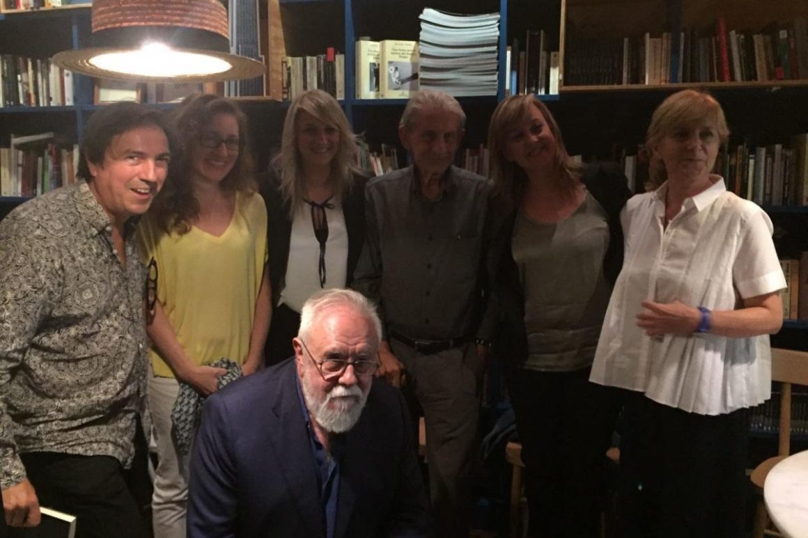 Imagen de la presentación de Hablemos de cine (2016). En el centro de la imagen, Gonzalo Suárez. Tras él, Basilio Martín Patino junto a la autora, Lucía Tello Díaz. A la izquierda, Julia Montejo, Álvaro García Capelo. A la derecha, Azucena Rodríguez.