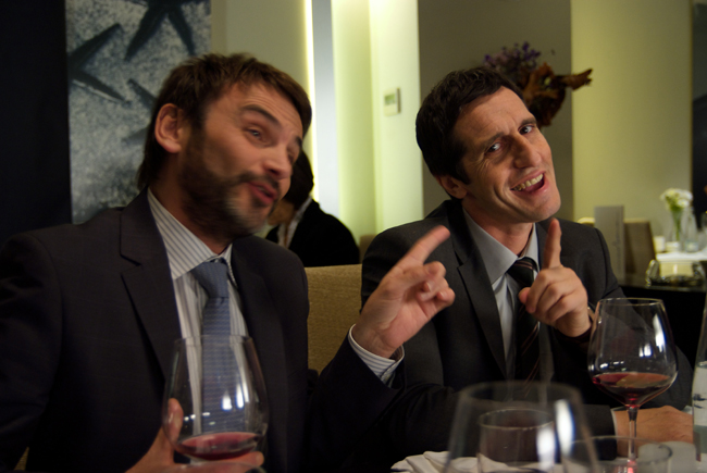 Son compañeros, en el cine rivales y en realidad cómplices. Fernando Tejero y Diego Peretti presentan En fuera de juego como si de un partido amistoso se tratase, nada de competencia, todo de compenetración. Ascendemos hasta el piso trece del edificio de Telefónica, en plena Gran Vía, y sin superstición y mucha labia, nos sentamos en una sala circular con vistas infinitas. Uno es andaluz y el otro argentino; uno muy hablador y el otro comedido; Tejero lo da todo y Peretti ausculta su entorno y calla. Por algo es psiquiatra. Se acomodan a mi vera y rompemos el hielo mencionando a Bankia, amargo tema de comienzo para una entrevista que se presupone cómica. Ambos reflexionan acerca de la vida, de la crisis, de la abulia que produce abrir día a día un periódico pesimista irredento, del dinero, del arte, y de la comedia. Porque estos dos actores comprometidos con la sociedad que les ha tocado vivir, han elegido sin pudor la risa para hablar del drama, han revisado los postulados de los grandes genios y han concluido, para mi comodidad y sosiego, que no hay desgracia en la vida que no se digiera mejor con grandes dosis de humor y elocuencia.