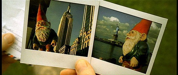 Por otra parte Amélie (2001, Jean-Pierre Jeunet), nos acerca otra historia, esta vez de viajes. No es la primera película que emplea el recurso de realizar fotografías de todos los lugares del mundo que alguien visita pero en Amélie, todo es mágia. Una niña (Audrey Tautou) se cría como una enferma, de tanto mirar su corazón se olvidan de que le falta el cariño y los abrazos. De mayor se convierte en un hada buena, y a ese padre tan preocupado que no sale nunca de su casa, le sustrae un gnomo del jardín y le lleva a ver el mundo, y al igual que la pequeña Brígida le manda cartas a Elsi, el gnomo le mandará fotografías a él. Las fotos que el padre recibe del gnomo están llenas de vida, aunque sea vicariamente él también viaja. Amélie cuida de todos, de sus vecinos, de sus amigos, y no olvida hacer magia donde no la hay.