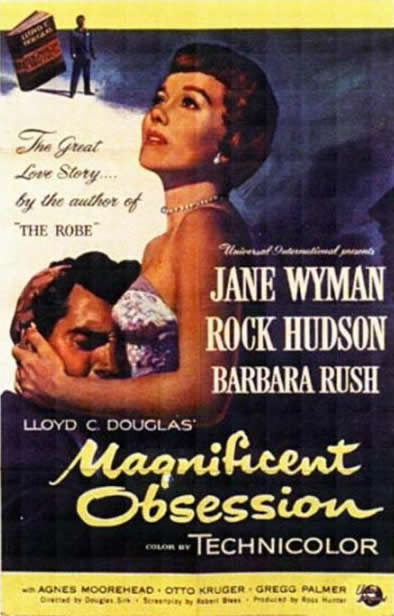 Hoy os propongo dos películas. La primera, y por orden cronológico, es Obsesión (1954), de Douglas Sirk, con Rock Hudson y Jane Wyman, quien incluso estuvo nominada por esta magnífica interpretación. Esta película es un remake de otra producción homónima (Magnificent Obsession) del año 1935 dirigida por John Stahl, ambas basadas en la novela de Lloyd C. Douglas (1929). La historia nos lleva a un lujoso lugar donde Bob Merrick (Hudson) tiene un accidente en su lancha, y el doctor Phillips le salva la vida. El doctor Phillips, a su vez, deja viuda a Helen (Wyman), quien tras su viudedad se ve arruinada, ya que su marido se dedicaba a ayudar a los demás de una forma anónima, un altruismo que parecía pasarle factura.